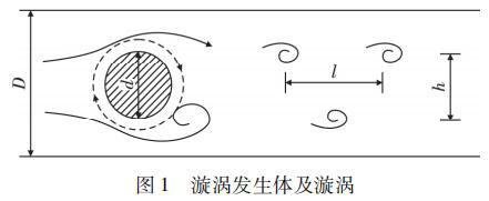 蒸汽流量計是由漩渦發生體、頻率檢測器和信號轉換器等環節組成,輸出 4 ~ 20 mADC 信號或脈沖電壓信號。其測量原理是在流動的流體中的垂直流動方向安放 1 根或多根非流體型阻流體,在一定的流量范圍內,流體在阻流體兩側交替地分離、釋放出 2 串頻率正比于管道內的平均流速、規則的、不對稱有規律的交替漩渦列,如圖 1 所示,且兩側漩渦旋轉方向相反。采用檢測元件測出漩渦頻率就可以推算出流體的流量。