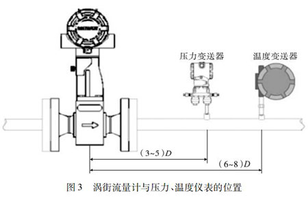 蒸汽流量計的口徑如果與工藝管道相同,不能滿足流量儀表要求時,或者在此流速下測量準確度不能保證時,需要縮小儀表口徑,從而提高管內流速,保證測量精度。上下游必須有足夠的直管段,若傳感器安裝點的上游在同一平面上有 2 個 90°彎頭時,上游直管段≥25D,下游直管段≥5D。根據測量的需要,需在蒸汽流量計附近測量壓力和溫度時,測壓點應在傳感器下游的( 3 ~ 5) D 處,測溫點應在傳感器下游的( 6 ~ 8) D 處,如圖 3 所示。