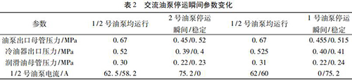 通過內(nèi)部旁通將冷油與熱油混合,經(jīng)過銅粉- 煤油 - 蠟感溫元件控制冷熱油混合比例,將油溫調(diào)節(jié)到 49 ℃。一臺(tái)智能電磁流量計(jì)穩(wěn)定運(yùn)行,油泵出口母管壓力 0. 5 MPa,潤(rùn)滑油母管壓力 0. 24 MPa,均屬于正常情況,而兩臺(tái)交流油泵并列運(yùn)行時(shí),停運(yùn)其中一臺(tái)交流油泵瞬間會(huì)觸發(fā)智能電磁流量計(jì)出口母管壓力開關(guān)動(dòng)作,說明停運(yùn)瞬間油壓發(fā)生波動(dòng),且油泵出口母管油壓波動(dòng)至小于 0. 45 MPa。正常運(yùn)行時(shí)智能電磁流量計(jì)出口油溫 71.5 ℃,冷油器出口溫度45 ℃,混合后潤(rùn)滑油母管溫度52.5 ℃,由能量守恒定律可知,經(jīng)過冷油器的油量/不經(jīng)冷油器的油量= ( 71.5-52.5) ÷ ( 52.5- 45) = 2. 53,說明有 70% 左右的油量經(jīng)過冷油器。當(dāng) 2 臺(tái)智能電磁流量計(jì)運(yùn)行時(shí)油量大于單泵運(yùn)行,其中一臺(tái)智能電磁流量計(jì)瞬間停運(yùn)時(shí)油量減少,尤其是經(jīng)過冷油器的油量大量減少,油量在溫控閥二次分配過程中出現(xiàn)調(diào)節(jié)異常,導(dǎo)致油壓過大波動(dòng)。為檢驗(yàn)溫控閥工作情況,保持 1 號(hào)、2 號(hào)交流油泵運(yùn)行,選取機(jī)組正常帶負(fù)荷運(yùn)行時(shí)油溫 52 ℃,分別停運(yùn) 1、2 號(hào)交流油泵,觀察 1、2 號(hào)交流油泵停運(yùn)瞬間油泵出口母管壓力波動(dòng)情況,試驗(yàn)各參數(shù)變化見表 2。