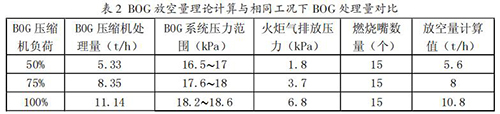為維持 BOG 系統壓力穩定,在正常工況下通過 BOG壓縮機回收 BOG 方式進行,在檢修期間采用火炬放空方式進行。從表 2 中可以看出,在系統壓力維持一定值時,理論計算值與 BOG 壓縮機處理量基本相同,火炬氣放空量 計算方法可行。
