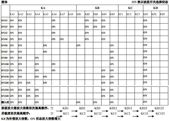 RG=1-F 調(diào)放大器增益,由 1 至 F 依次增大(常用 4-8);RS=1-F 調(diào)觸發(fā)靈敏度,由 1 至 F 依次提高(常用 4-8)不同口徑和介質(zhì)開關(guān)選擇參見附表。并根據(jù)實際信號先調(diào)整 K2 和 K3 擴展頻帶,必要時調(diào)整 K1 電荷放大器增益