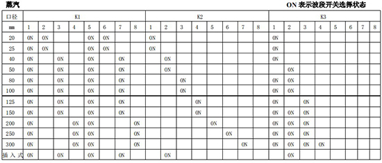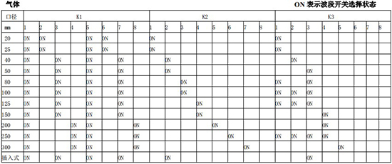 以上表值僅供參考,實際使用中因液體粘度和氣體密度不同應(yīng)在此值附近調(diào)整,頻率低時可將 K3 向大口徑方向調(diào)一至三檔。頻率高時可將 K2 向小口徑方向調(diào)一至三檔。