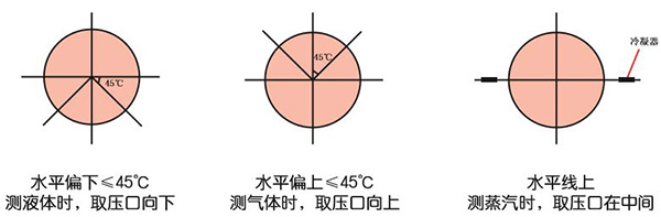 2、測氣體時,為防止液體進入導(dǎo)壓管,取壓口方向應(yīng)處于水平線上偏45度的位置以內(nèi),正、負取壓口在同一水平面上。