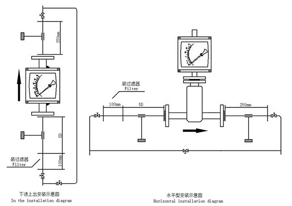4.若介質中含有固體雜質,應在閥門和直管段間加裝過濾器;若介質中含有鐵磁物質,應在指針浮子流量計的上游安裝磁過濾器。